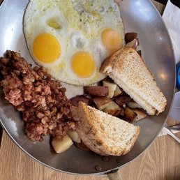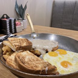 I was in the area doing my laundry at Ducky Wash and Dry and got hungry after I was done. I always drive by this place and yesterday decided to try it out. I wasn't planning on dining in, but after reading reviews and seeing pictures, I wanted to see if the reviews are indicative of the service and food quality. And, I wanted to see my food on a big skillet. When walking in, you'll find a homey and comfy atmosphere, and a welcoming server. I ordered the chicken fried steak dish that is served on a skillet, probably to provide room for the big portions. It comes with the chicken fried steak, 3 eggs done in your choosing, country potatoes (cubed potatoes), and your choice of toast (I chose sourdough toast). I felt more than satisfied during and after the meal and do recommend eating at Dublin Skillet.
